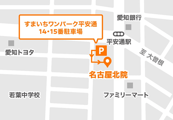 当ビルから北へ10m行ったところにある駐車場「すまいちワンパーク平安通」に入って右側の14番・15番をご利用ください。