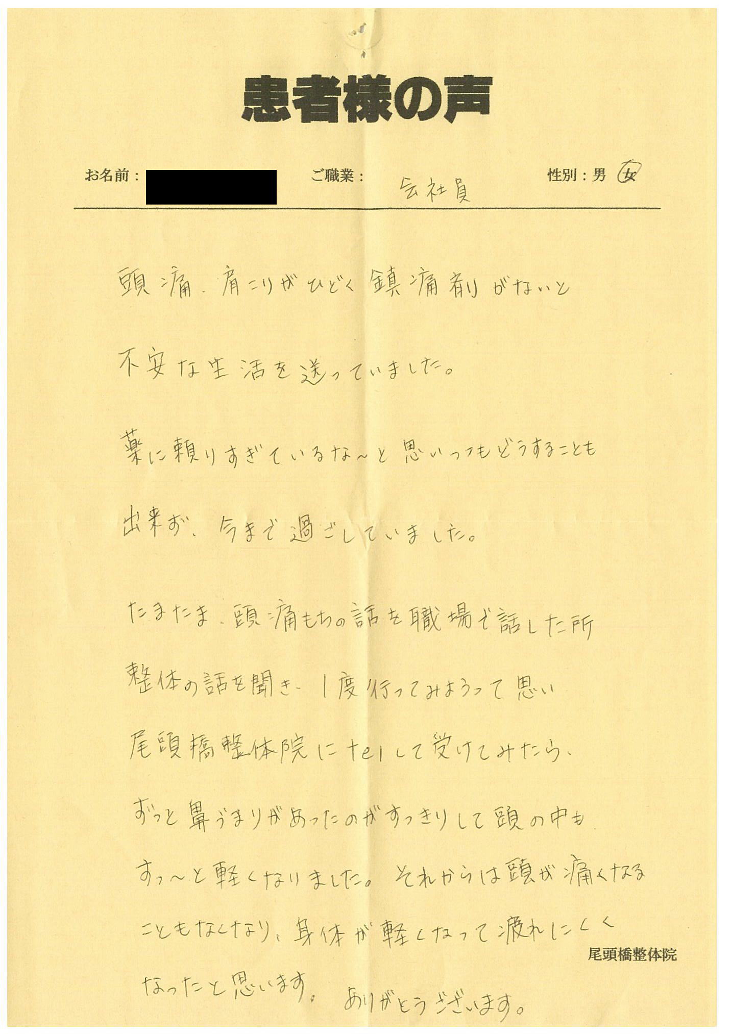 頭痛、肩こりがひどく鎮痛剤がないと不安な生活を送っていました。薬に頼りすぎているな~と思いつつもどうすることも出来ず、今まで過ごしていました。たまたま、頭痛もちの話を職場で話した所、整体の話を聞き一度行ってみようって思い尾頭橋整体院にTELして、受けてみたら、ずっと鼻づまりがあったのがすっきりして頭の中もすっ~と軽くなりました。それからは頭が痛くなることもなくなり、身体が軽くなって疲れにくくなったと思います。ありがとうございます。