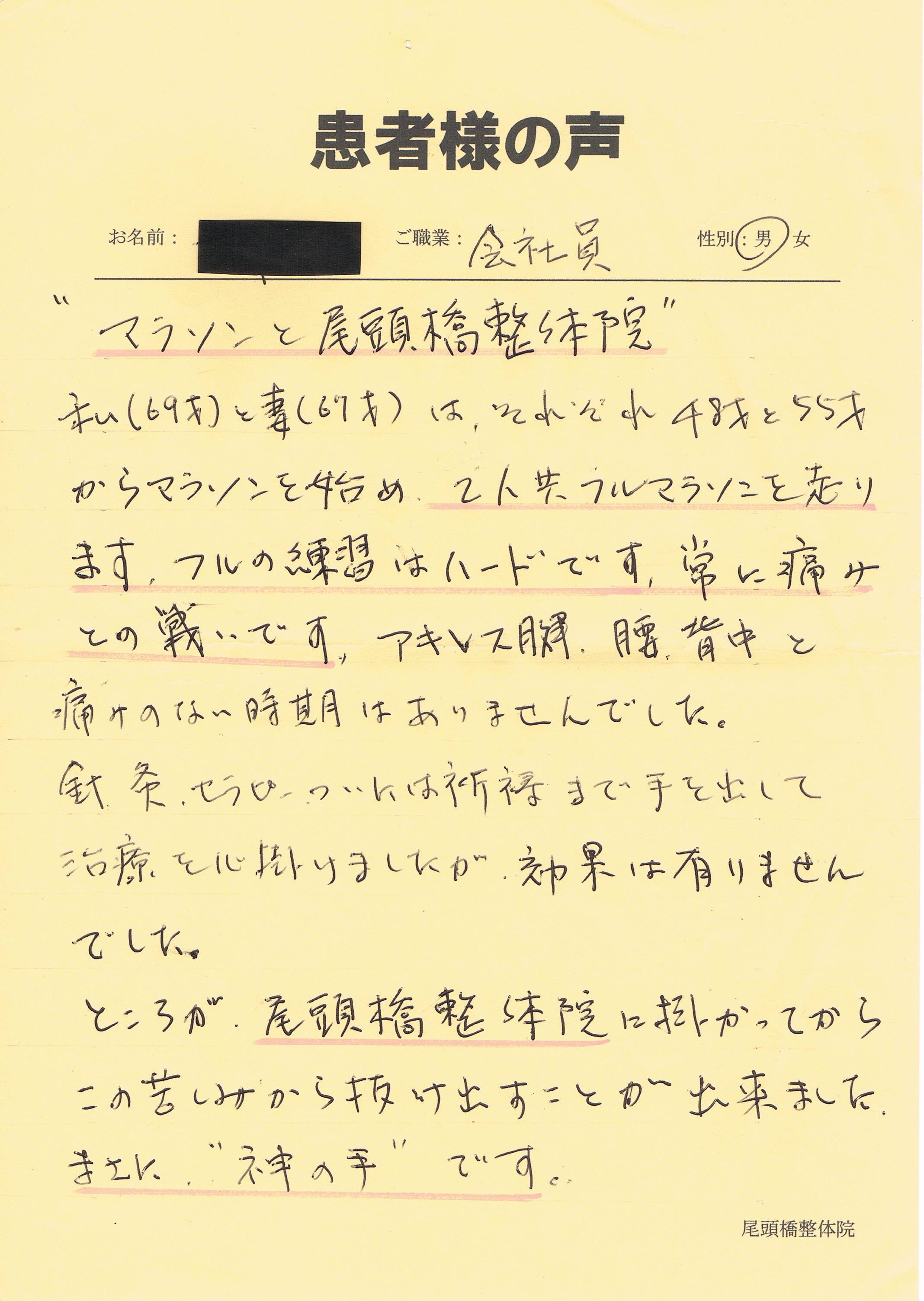 私(69才)と妻(67才)は、それぞれ48才と55才からマラソンを始め、2人共フルマラソンを走ります。フルの練習はハードで、常に痛みとの戦いです。アキレス腱、腰、背中と痛みのない時期はありませんでした。鍼灸、セラピー、ついには祈祷まで手を出して治療を心掛けましたが、効果はありませんでした。ところが、尾頭橋整体院に掛かってからこの苦しみから抜け出すことが出来ました。まさに”神の手”です。お陰様でこの歳になっても年15~20レース程度の大小の大会を楽しんでいます。痛みに苦しんでいる人にはぜひ、尾頭橋整体院を知ってもらえたらと思っています。