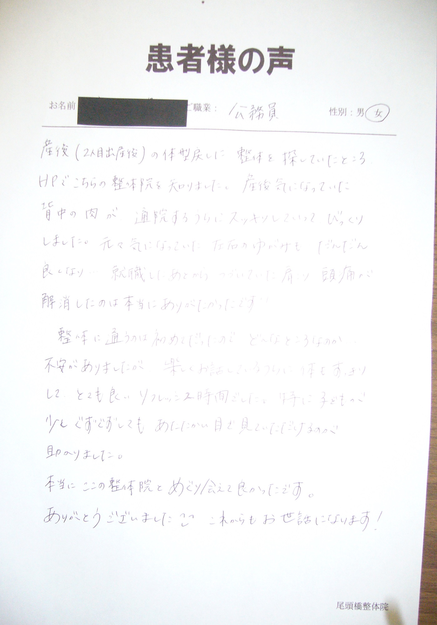 本当にここの整体院とめぐり会えて良かったです。