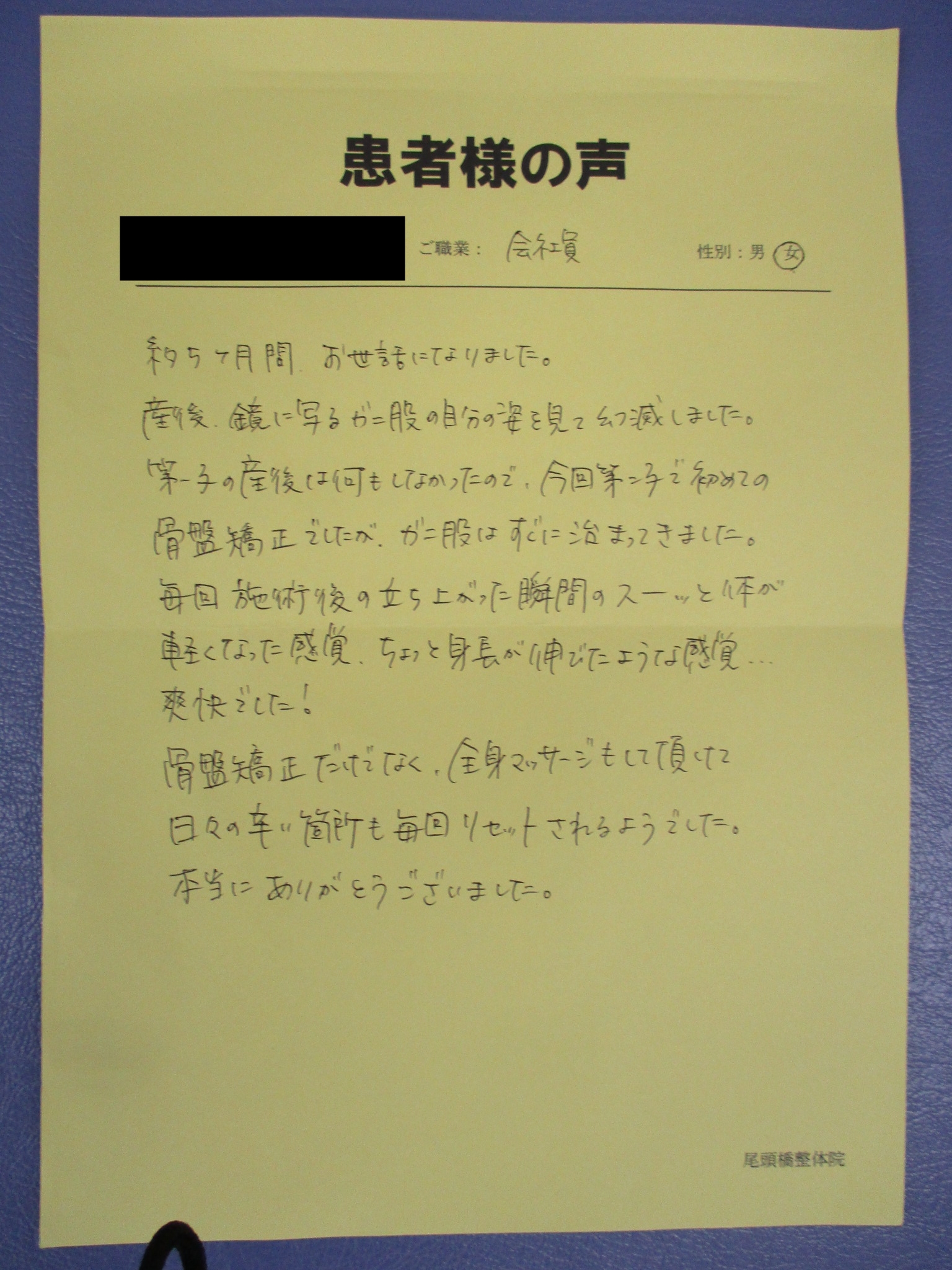 約5ヶ月間、お世話になりました。産後、鏡に写るガニ股の自分の姿を見て幻滅しました。第一子の産後は何もしなかったので、今回第二子で初めての骨盤矯正でしたが、ガニ股はすぐに治まってきました。毎回施術後の立ち上がった瞬間のスーッと体が軽くなった感覚、ちょっと伸長が伸びたような感覚…爽快でした!骨盤矯正だけでなく、全身マッサージもしていただけて日々の辛い箇所も毎回リセットされるようでした。本当にありがとうございました。