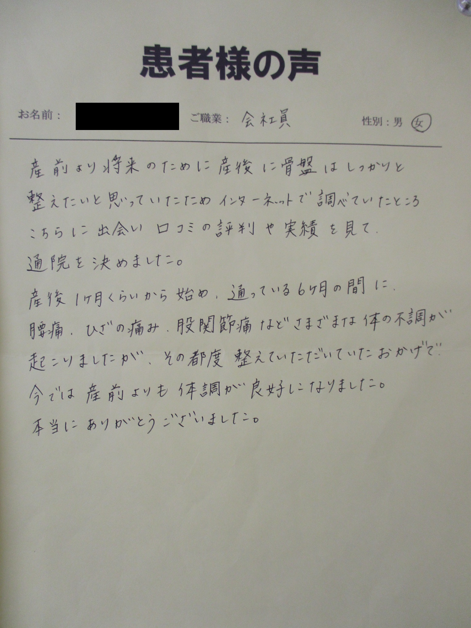 産前より将来の為に産後に骨盤はしっかりと整えたいと思っていたためインターネットで調べていたところこちらに出会い口コミの評判や実績をみて通院を決めました。産後1ヶ月くらいから始め、通っている6ヶ月の間に、腰痛、ひざの痛み、股関節痛など様々な体の不調が起こりましたが、その都度整えていただいていたおかげでいまでゃ産前よりも体調が良好になりました。本当にありがとうございました。