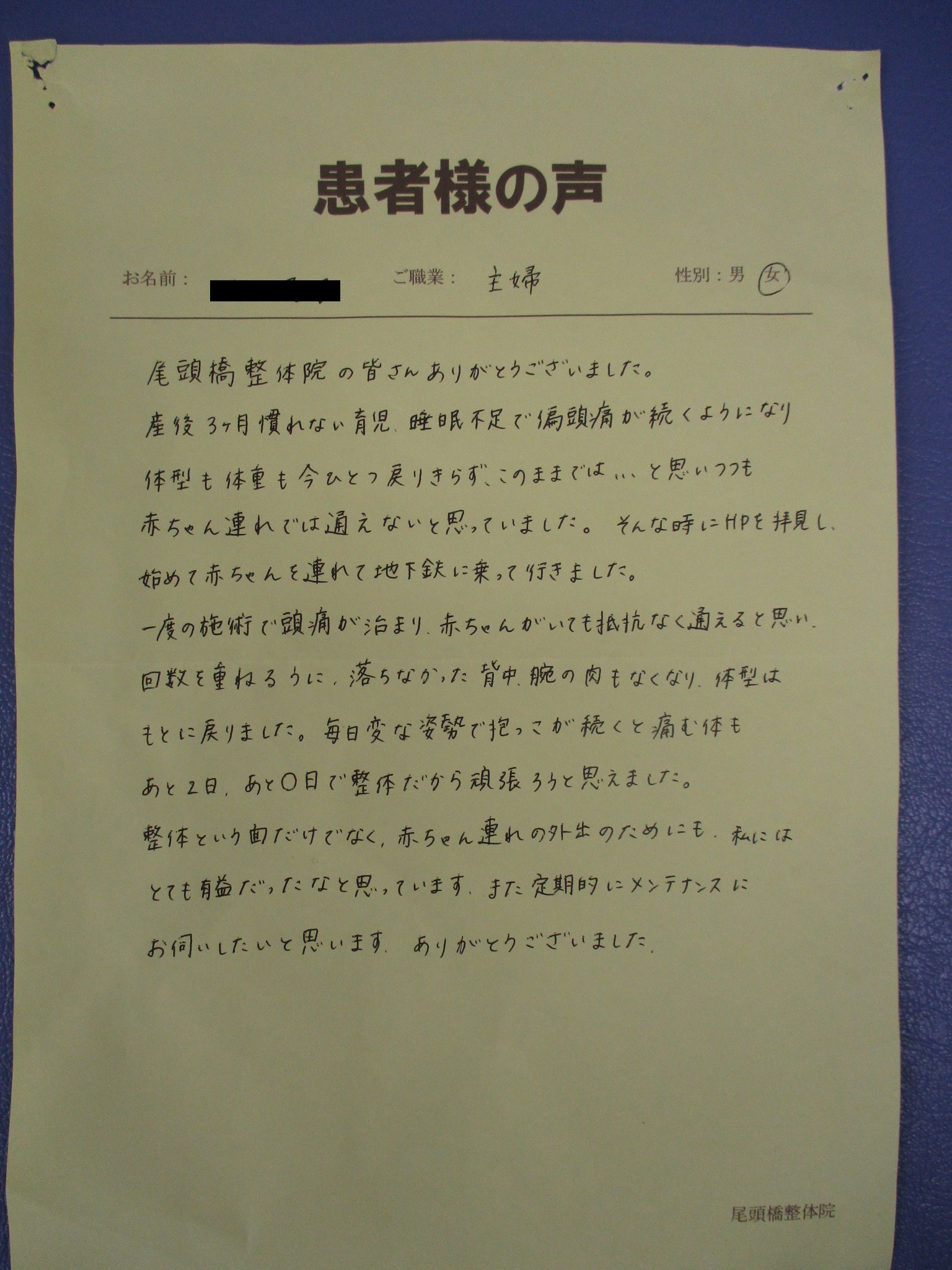 尾頭橋整体院の皆さんありがとうございました。産後3ヶ月慣れない育児、睡眠不足で偏頭痛が続くようになり、体型も体重も今ひとつ戻りきらず、このままでは…と思いつつも赤ちゃん連れでは通えないと思っていました。そんな時にHPを拝見し、初めて赤ちゃんを連れて地下鉄に乗って行きました。一度の施術で頭痛が治まり、赤ちゃんがいても抵抗なく通えると思い、回数を重ねるうちに落ちなかった背中、腕の肉もなくなり体型は元に戻りました。毎日変な姿勢で抱っこが続くと痛む体もあと2日、あと〇日で整体だから頑張ろうと思えました。整体という面だけでなく、赤ちゃん連れの外出のためにも、私にはとても有益だったなと思っています。また定期的にメンテナンスにお伺いしたいと思います。ありがとうございました。
