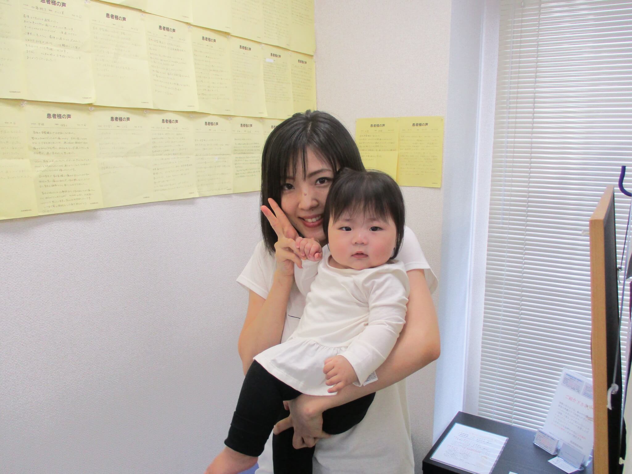 産後1か月から、腰のぐらつきが気になり通院しました。はじめは骨盤ベルトを着用していないと歩くのも不安な程で、かなり体の歪みもあると言われていましたが、先生から安定してくるよと言われていた産後6か月には本当に歪みも痛みもなくなり、産前よりも骨盤が閉じた感じがしています。授乳やおむつかえでどうしても前かがみの姿勢が多く、首のコリもあったので、その日の体調に合わせて施術していただけて、本当に楽になりました。毎回、石田先生に施術していただいていますが、お子さんの年齢が近いことや、通院していらっしゃるママさん達の声をたくさん聞いていらっしゃるので、流行のベビーグッズやお出かけスポットなど毎回とっても楽しくお話しながらの施術であっという間の30分でした。頻繁に通えたのも、先生との楽しいおしゃべりのおかげが大きいかも(笑)これからも、不調にあわせて通院を続けたいです。
