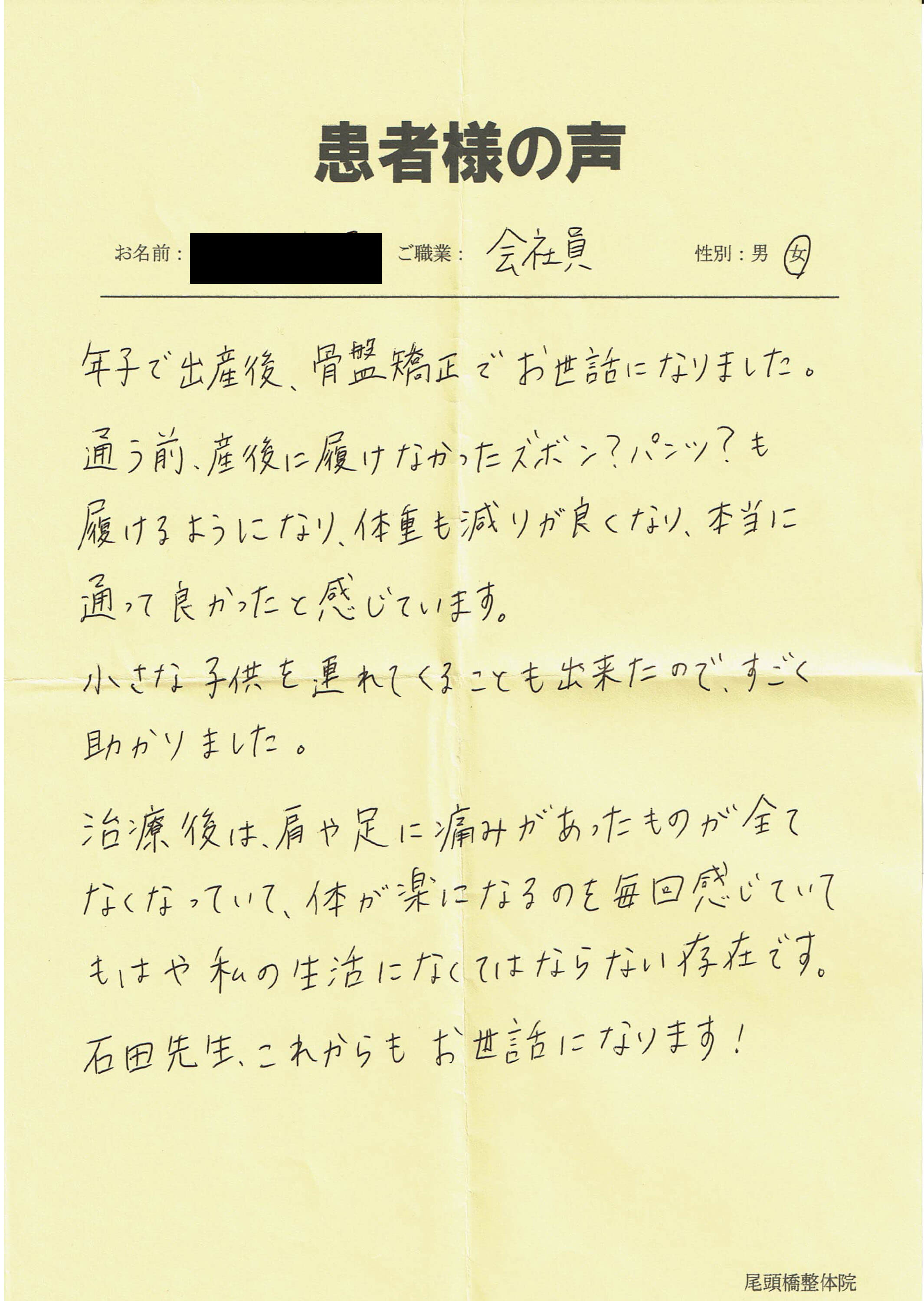 年子で出産後、骨盤矯正でお世話になりました。通う前、産後に履けなかったズボン?パンツ?も履けるようになり、体重も減りが良くなり、本当に通って良かったと感じています。小さな子供を連れてくることも出来たので、すごく助かりました。治療後は、肩や足に痛みがあったものが全てなくなっていて、体が楽になるのを毎回感じていてもはや私の生活になくてはならない存在です。石田先生、これからもお世話になります。