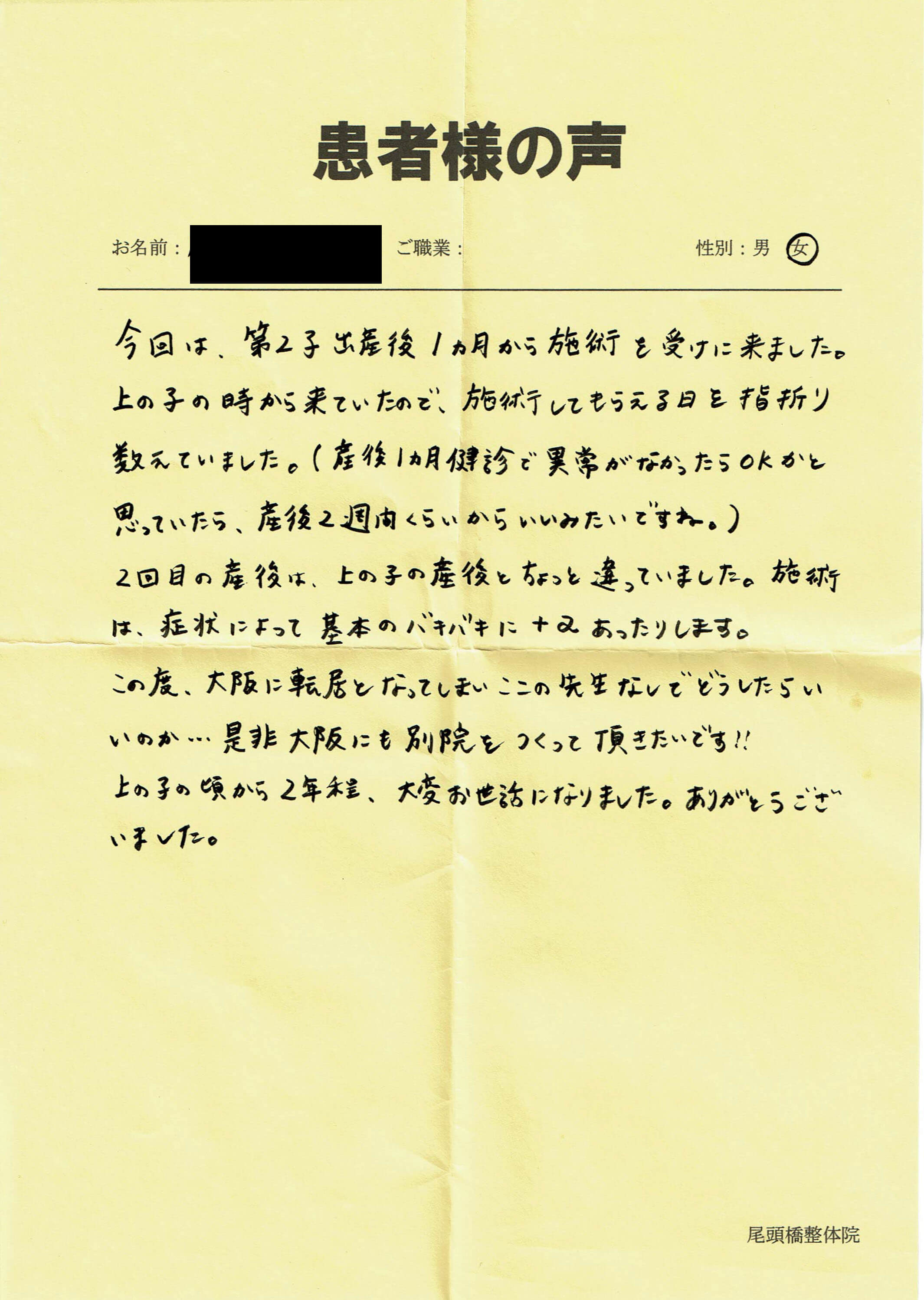 今回は、第2子出産後1ヵ月から施術を受けに来ました。上の子の時から来ていたので、施術してもらえる日を指折り数えていました。(産後1ヵ月検診で異常がなかったらOKかと思っていたら、産後2週間くらいからいいみたいですね。)2回目の産後は、上の子の産後とちょっと違っていました。施術は症状によって基本のバキバキに+αあったりします。この度、大阪に転居となってしまい、ここの先生なしでどうしたらいいのか・・・是非大阪にも別院を作って頂きたいです!!上の子の頃から2年程、大変お世話になりました。ありがとうございました。