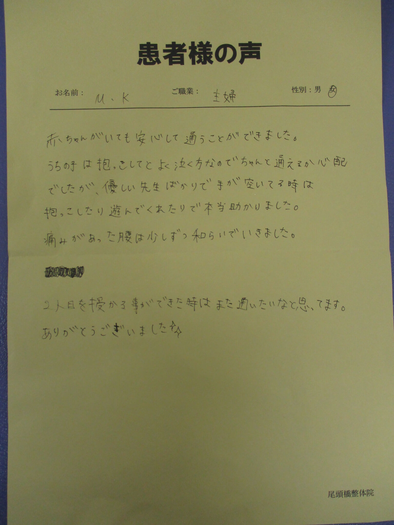 赤ちゃんがいても安心して通うことができました。うちの子は抱っこしてとよく泣く方なのでちゃんと通えるか心配でしたが、優しい先生ばかりで手が空いてる時は抱っこしたり遊んでくれたりで本当助かりました。痛みがあった腰は少しずつ和らいでいきました。2人目を授かる事ができた時はまた通いたいなと思ってます。ありがとうございました。