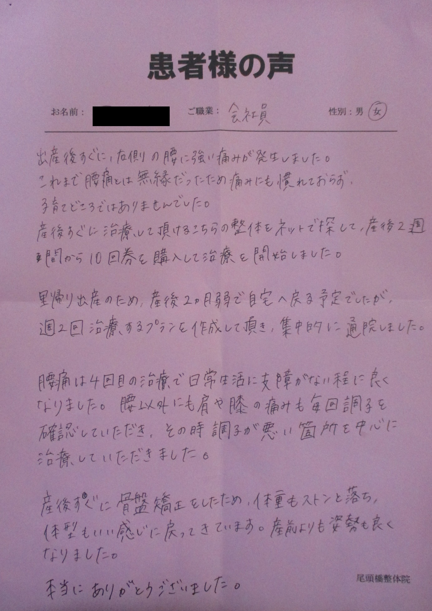 里帰り出産のため、産後2ヶ月弱で自宅へ戻る予定でしたが、週2回治療するプランを作成して頂き、集中的に通院しました。