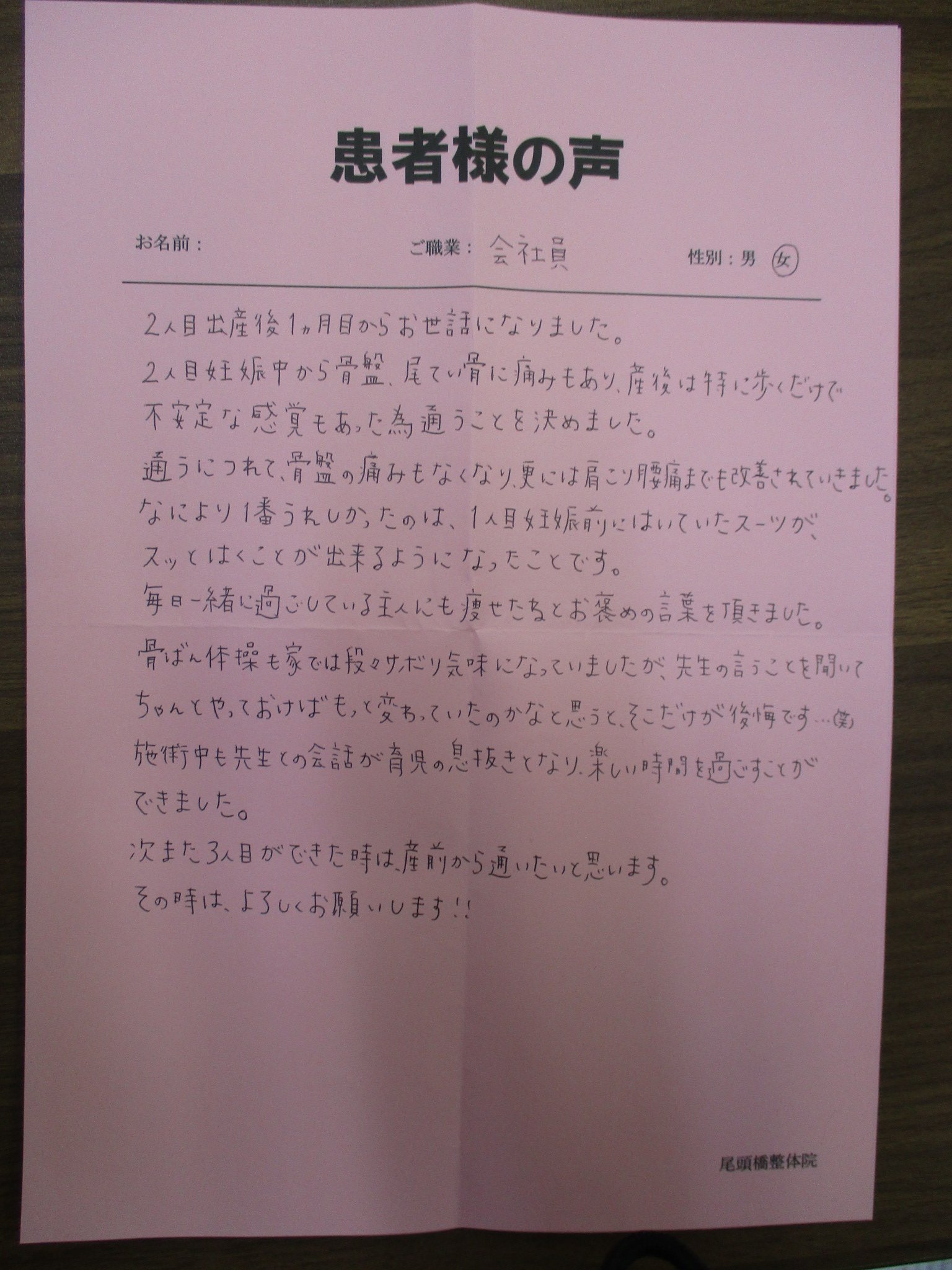 通うにつれて、骨盤の痛みもなくなり、更には肩こり腰痛までも改善されていきました。