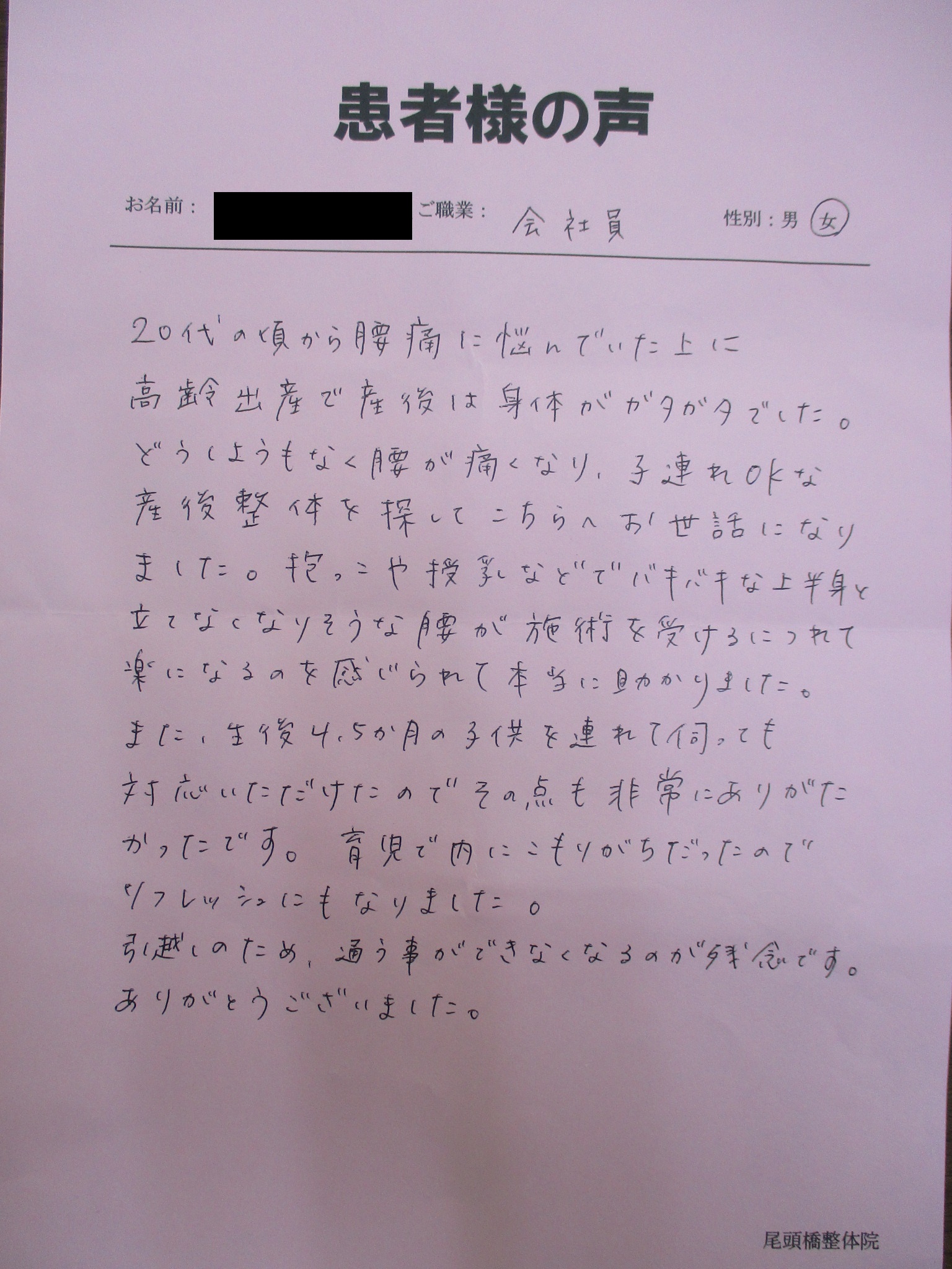 また、産後4~5ヶ月の子供を連れて伺っても対応いただけたのでその点も非常にありがたかったです。