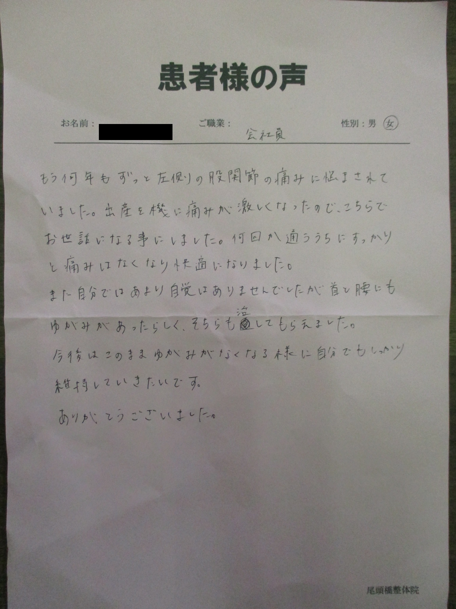 何回か通ううちにすっかりと痛みはなくなり快適になりました。また、自分ではあまり自覚はありませんでしたが、首と腰にもゆがみがあったらしくそちらも治してもらえました。