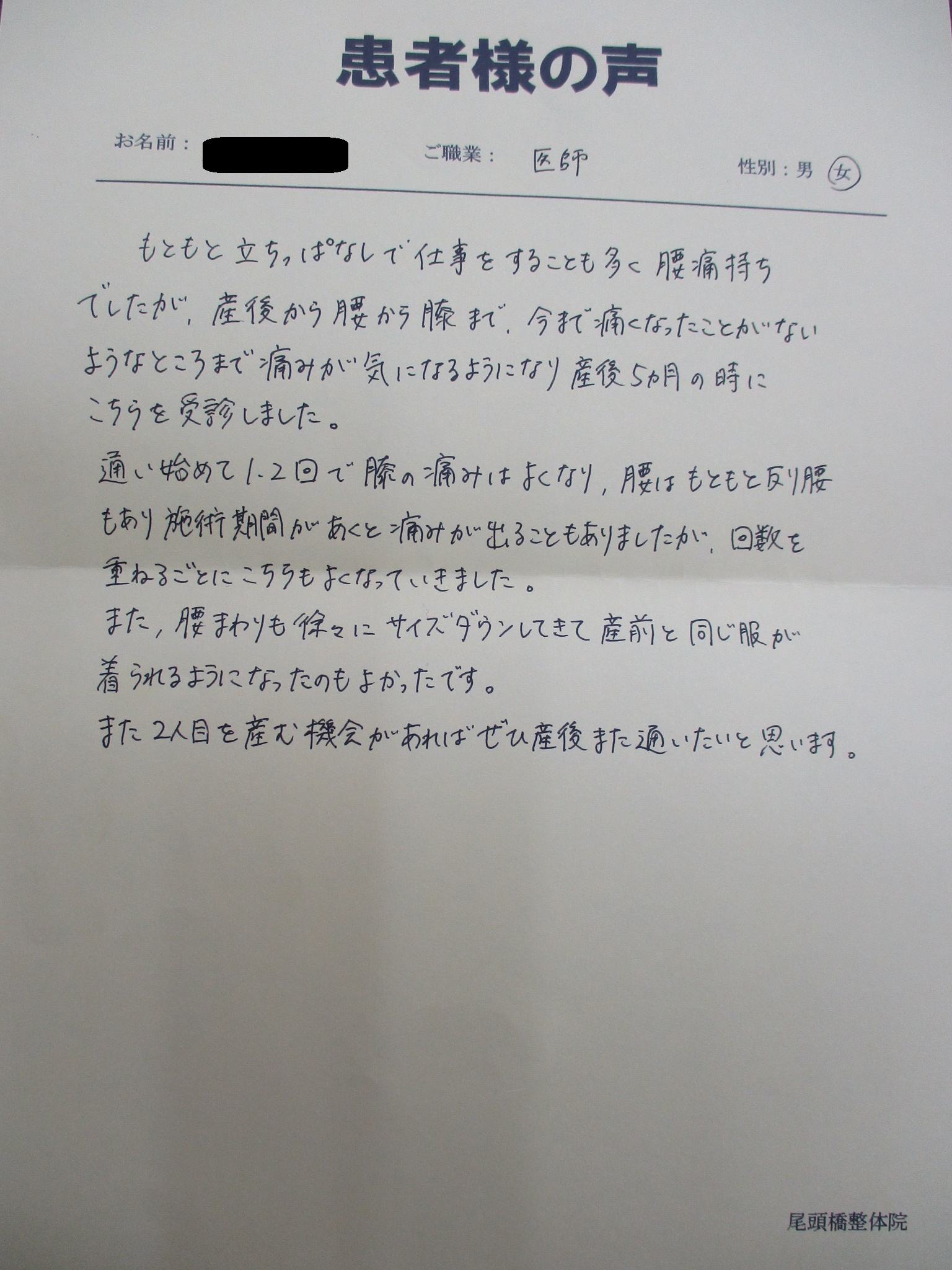 もともと立ちっぱなしで仕事をすることも多く、腰痛持ちでしたが、産後から腰から膝まで、今まで痛くなったことがないようなところまで痛みが気になるようになり、産後5ヶ月の時にこちらを受診しました。