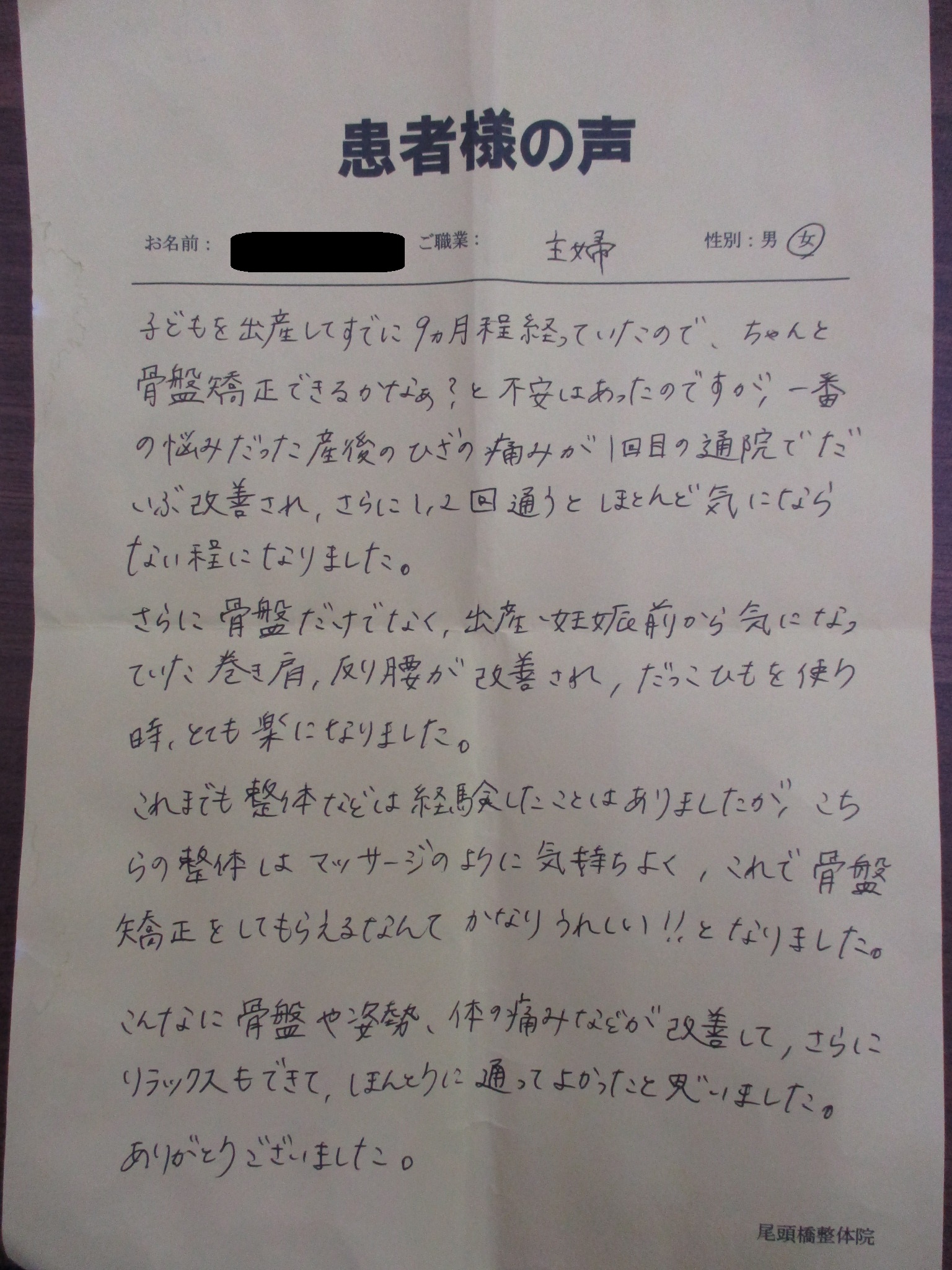 子供を出産してすでに9ヵ月程経っていたので、ちゃんと骨盤矯正できるかなぁ?と不安はあったのですが、一番の悩みだった産後のひざの痛みが1回目の通院でだいぶ改善され、さらに1~2回通うとほとんど気にならない程になりました。