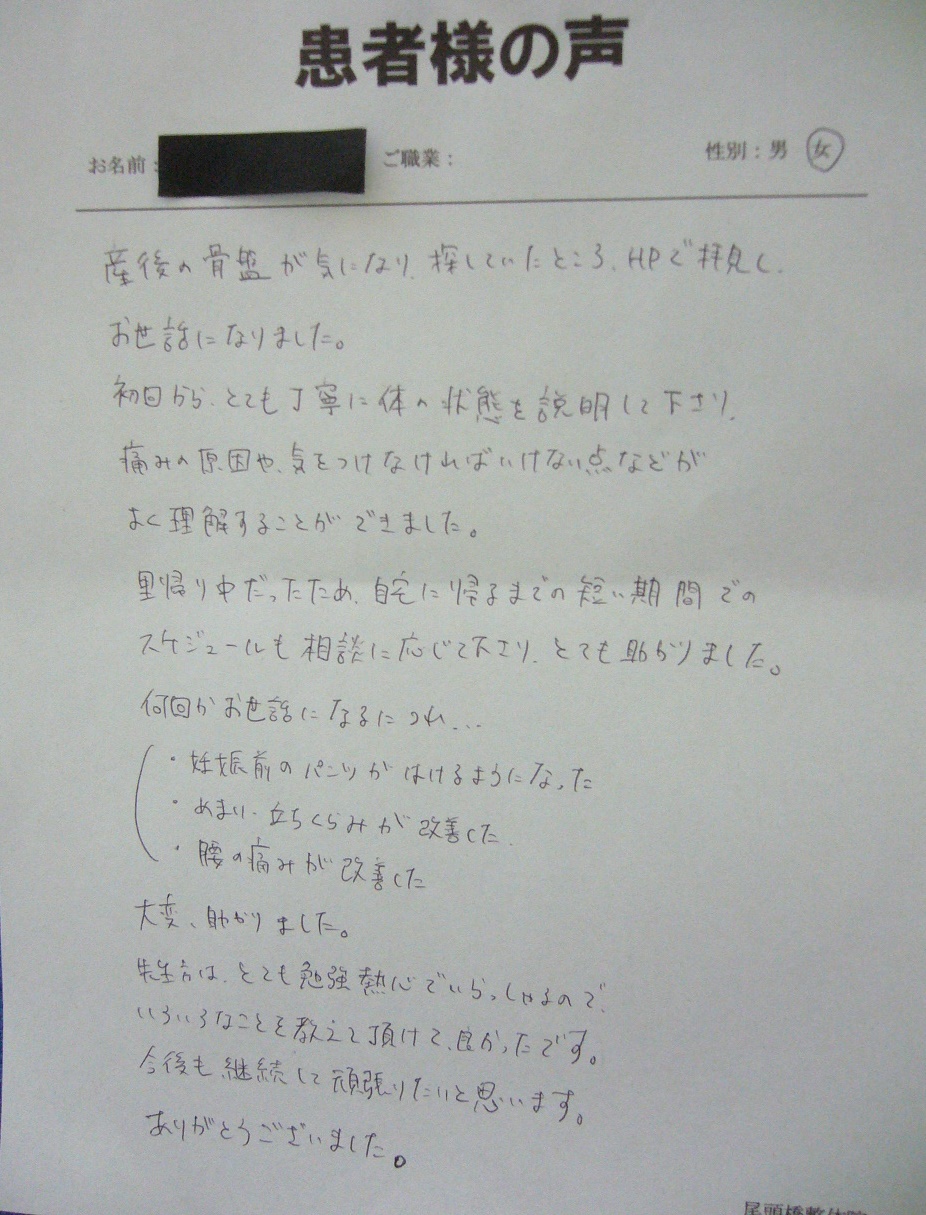 産後の骨盤が気になり、探していたところHPで拝見しお世話になりました。初回から、とても丁寧に体の状態を説明して下さり、痛みの原因や、気をつけなければいけない点などがよく理解することができました。里帰り中だったため、自宅に帰るまでの短い期間でのスケジュールも相談に応じて下さり、とても助かりました。何回かお世話になるにつれ・・・