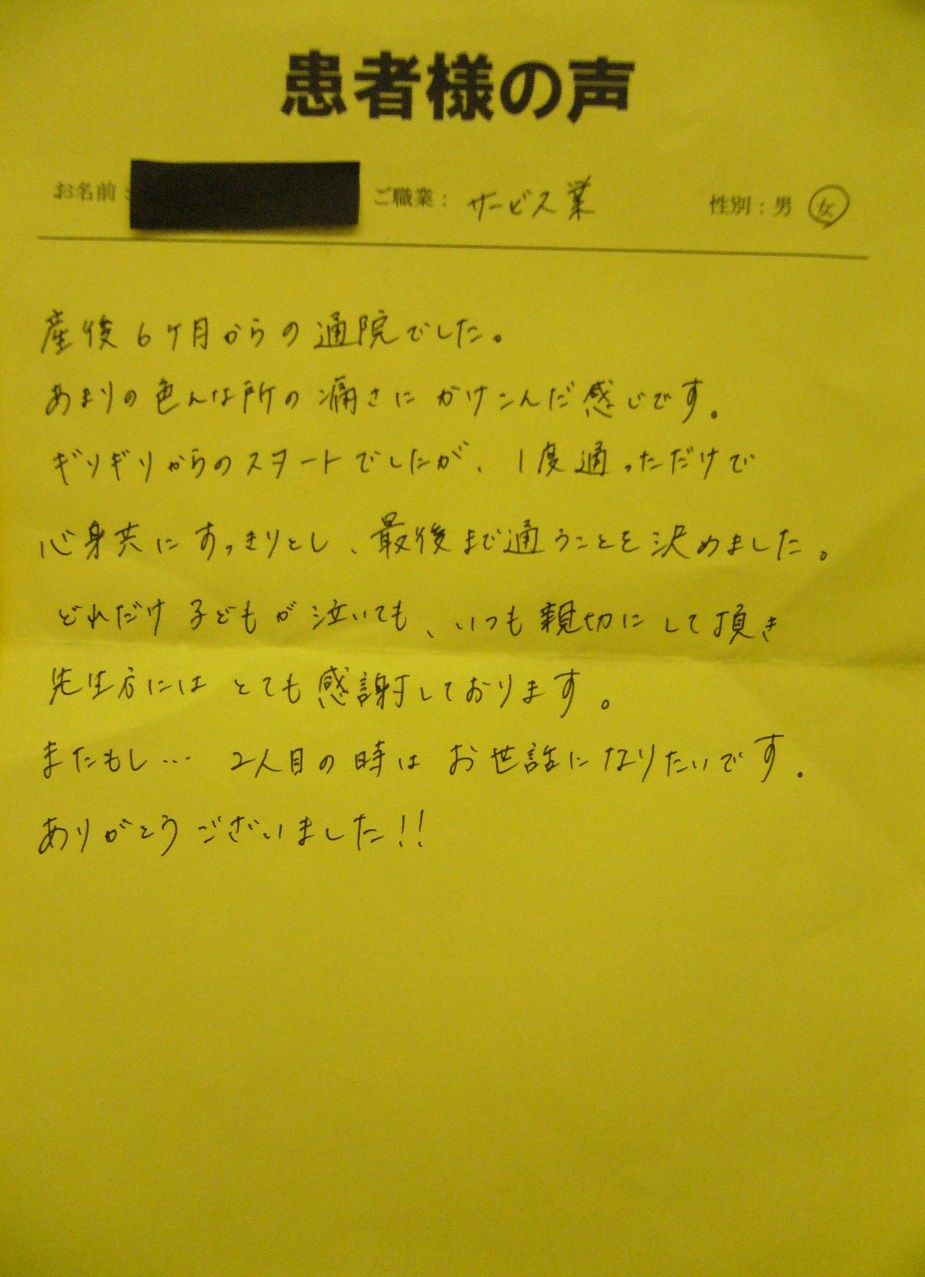 産後6ヶ月からの通院でした。あまりの色んな所の痛さにかけこんだ感じです。ギリギリからのスタートでしたが、一度通っただけで心身共にすっきりとし、最後まで通うことを決めました。どれだけ子供が泣いても、いつも親切にして頂き先生方にはとても感謝しています。またもし…2人目の時はお世話になりたいです。ありがとうございました!!