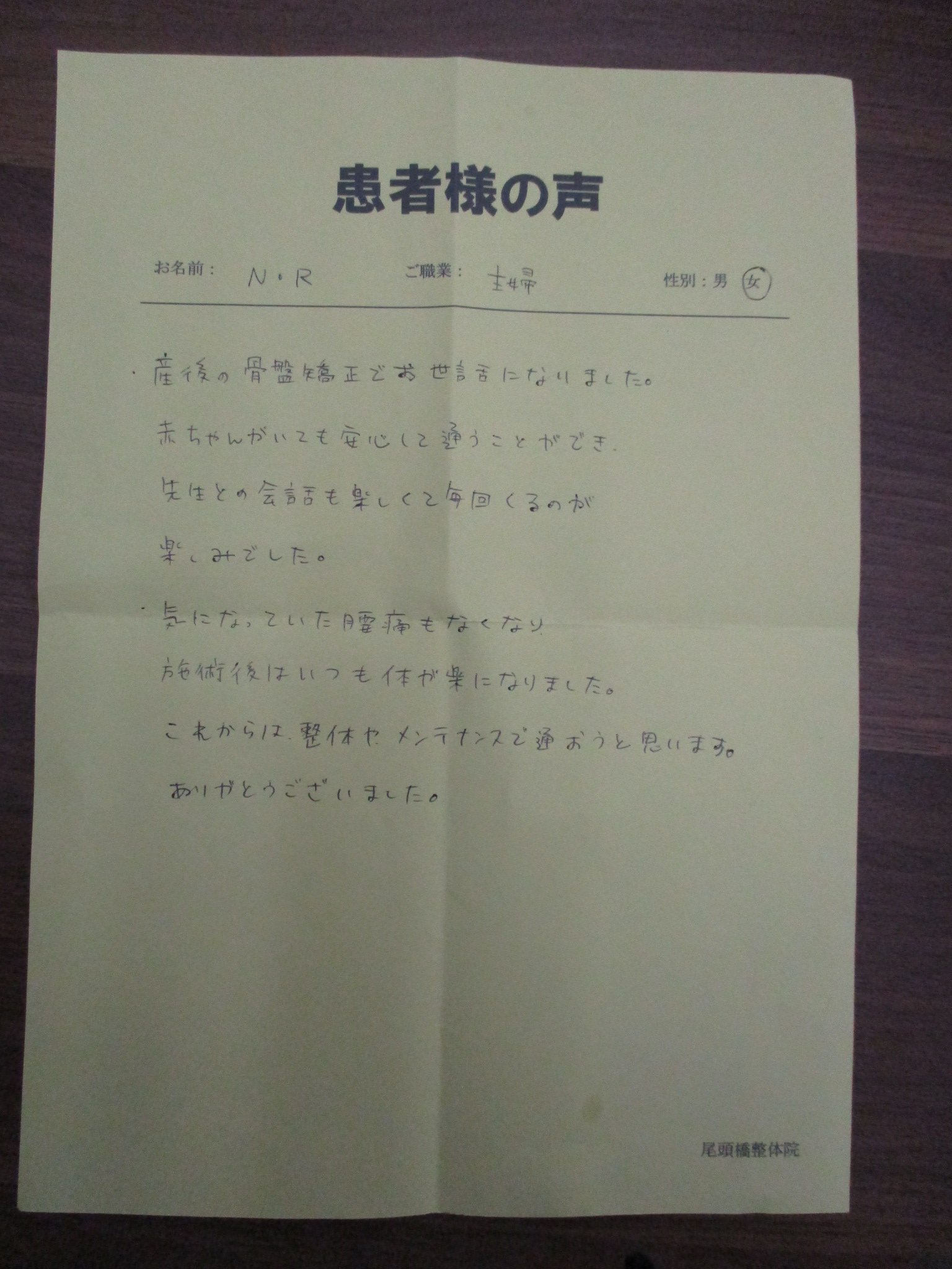 産後の骨盤矯正でお世話になりました。赤ちゃんがいても安心して通うことができ、先生との会話も楽しくて毎回くるのが楽しみでした。気になっていた腰痛もなくなり、施術後はいつも体が楽になりました。これからは、整体やメンテナンスで通おうと思います。ありがとうございました。