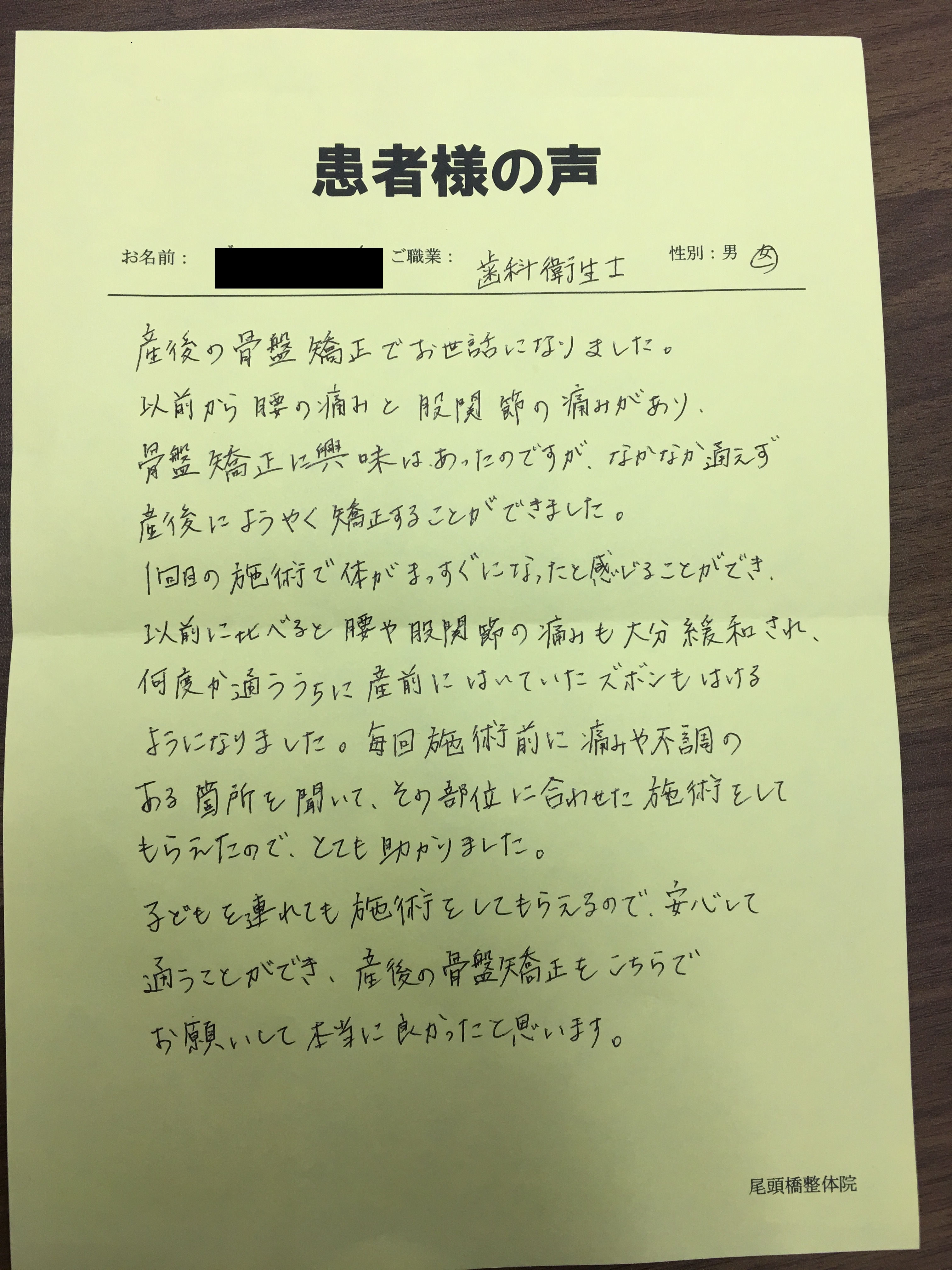 産後の骨盤矯正でお世話になりました。以前から腰の痛みと股関節の痛みがあり、骨盤矯正には興味はあったのですが、なかなか通えず産後にようやく矯正することができました。
